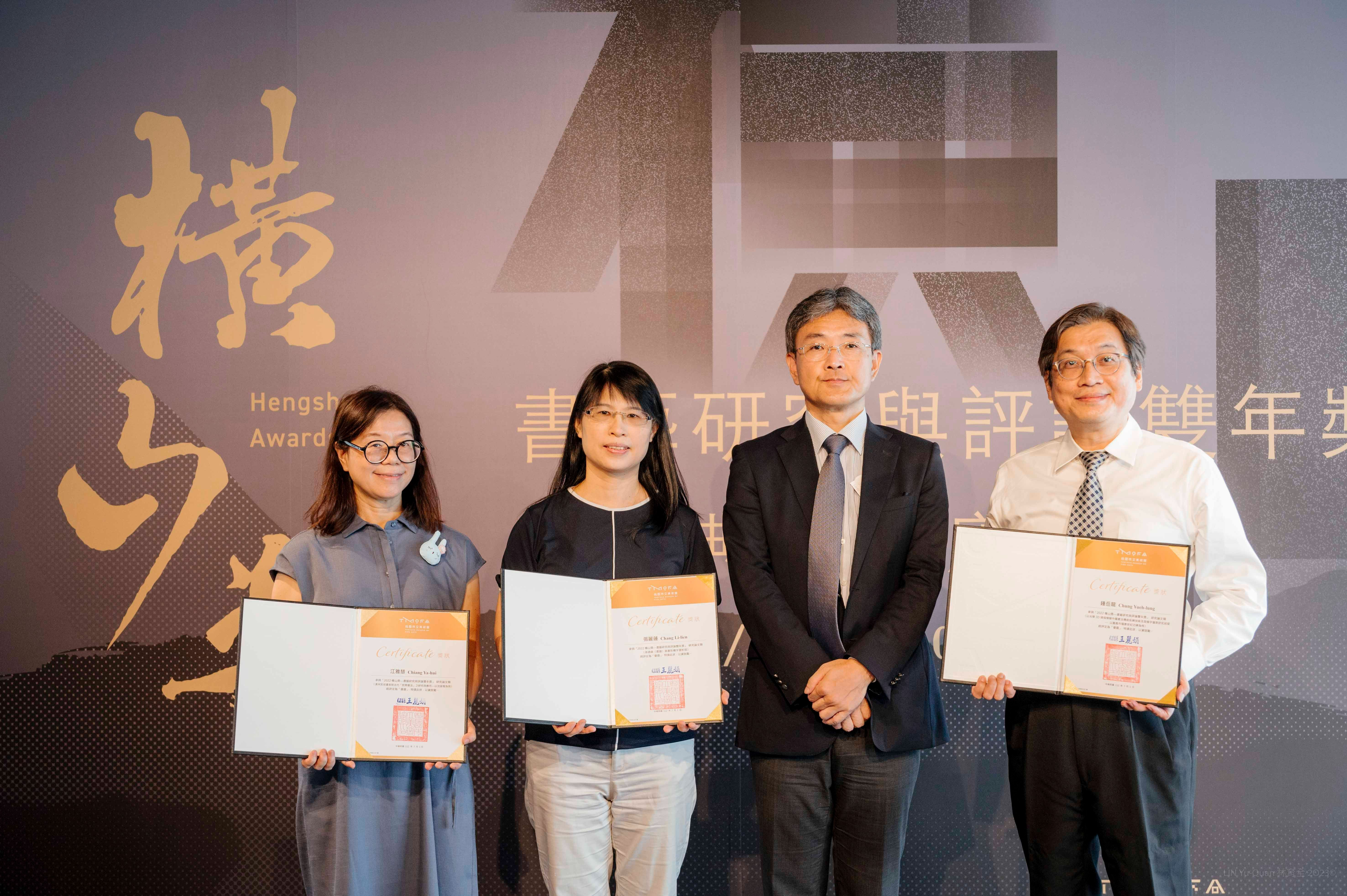 桃園市文化局の邱正生局長が最大賞「横山研究奨」を授与し、最高賞金15万台湾ドルは麦青龠の「于右任標準草書改良進程揭密与特殊版本・真偽釈疑」に授与されました。優秀賞は江雅慧の「清末民初書家對古代「民間書法」之研究与応用— 以沈曾植為例」、張麗蓮の「孫過庭書譜草書形構字源析探」、鍾岳龍の「以光學3D掃描模擬中国書法伝統拓碑技術及泐損字復原研究初探—以嘉義市福康安紀功碑為例」の3篇が選ばれました。「芸術評論」部門では李翠瑛の「持続的意図—従伝統与現代弁証到草書的創作思考」と馮以力の「當代書法芸術的縱横錯步—対各種発展進路之反思与商確」の2篇が優秀賞に選ばれました。今年の投稿作品の範囲は古代から現代にわたり、多様なテーマを取り上げ、現代書道研究と評論の多様な視点と深みを示しています。
