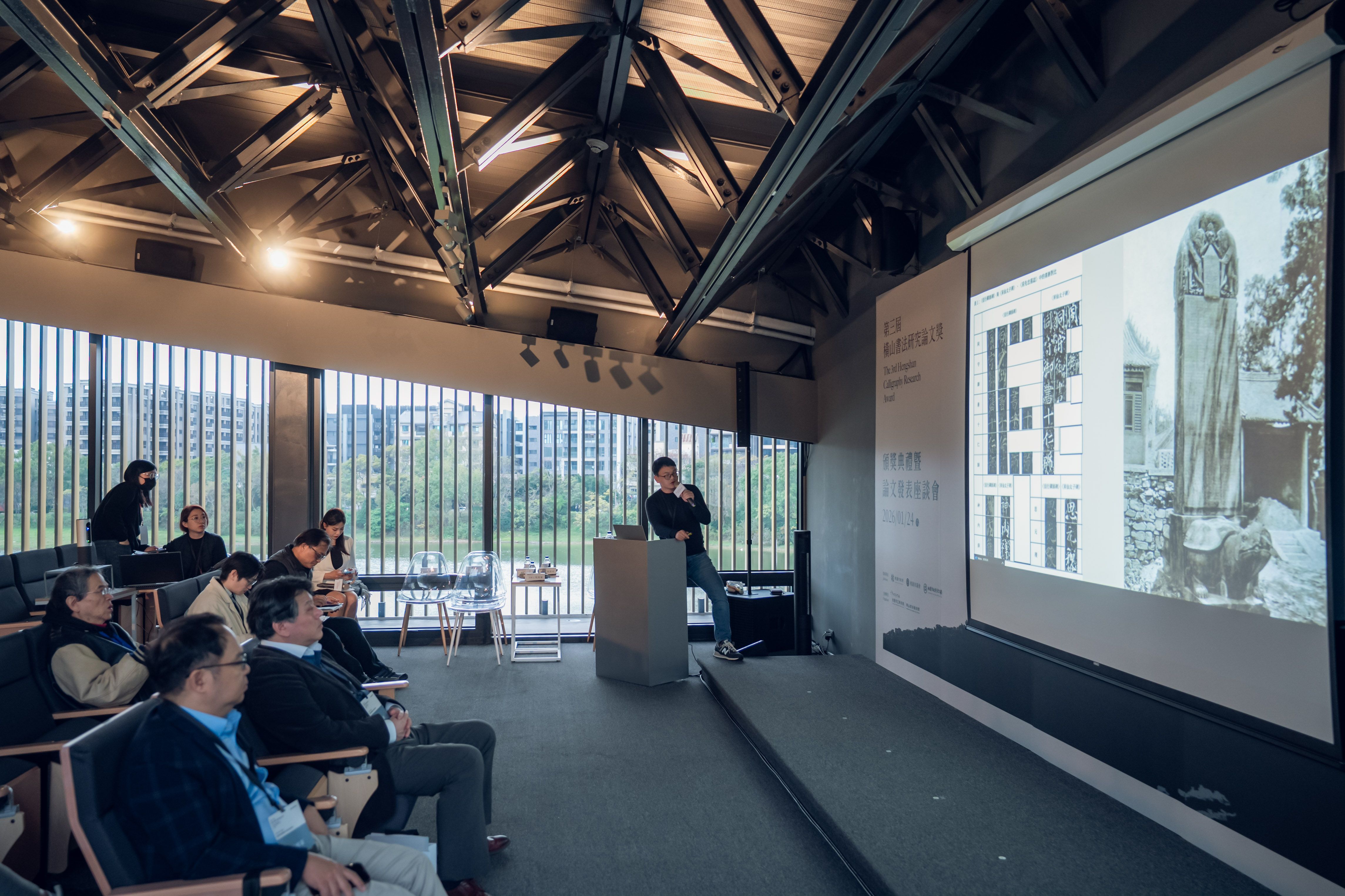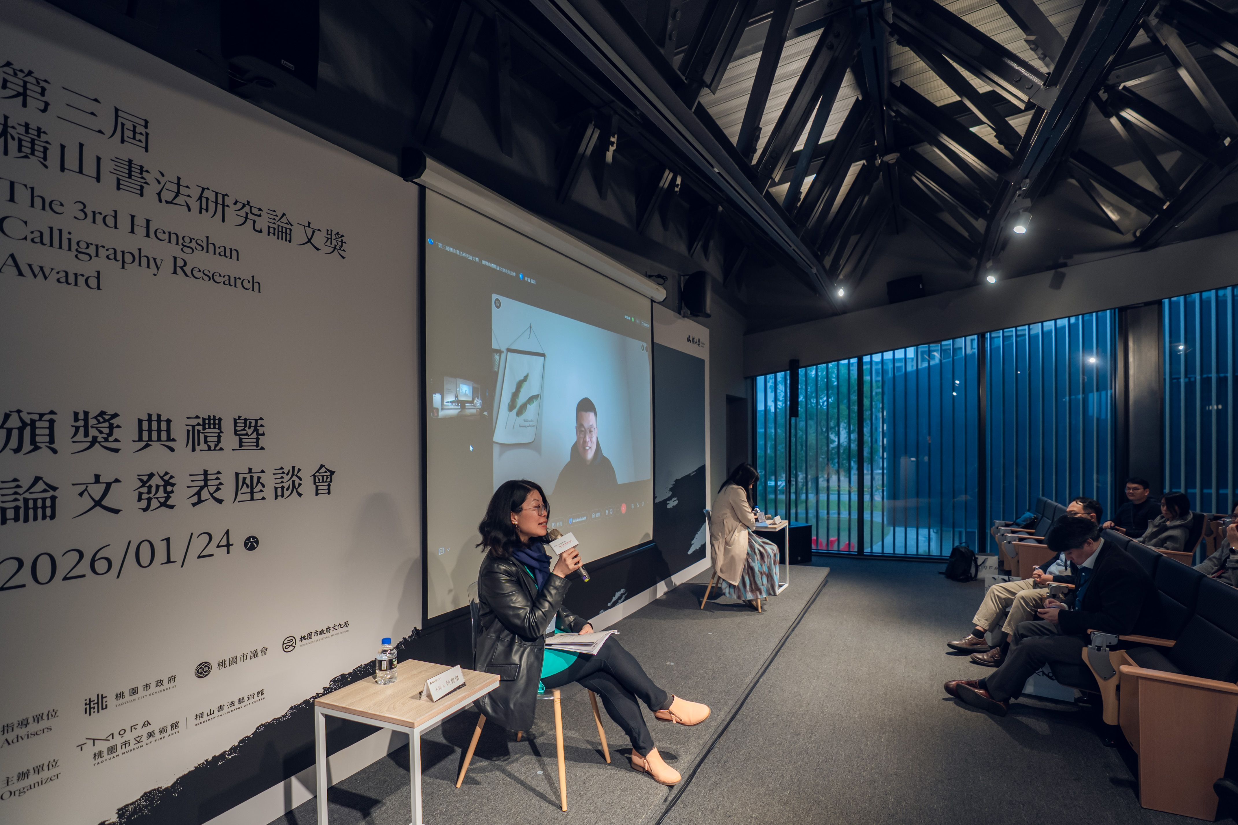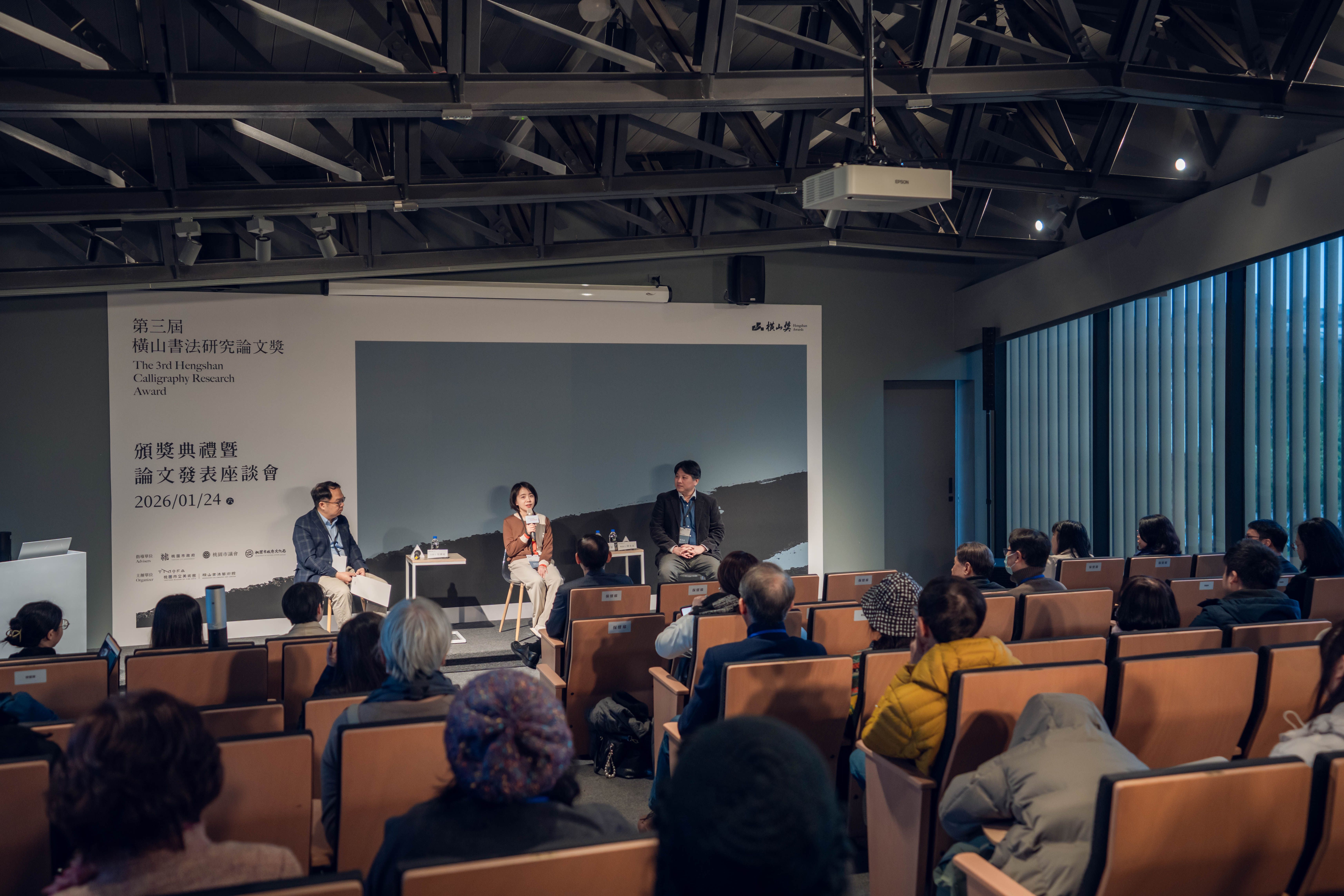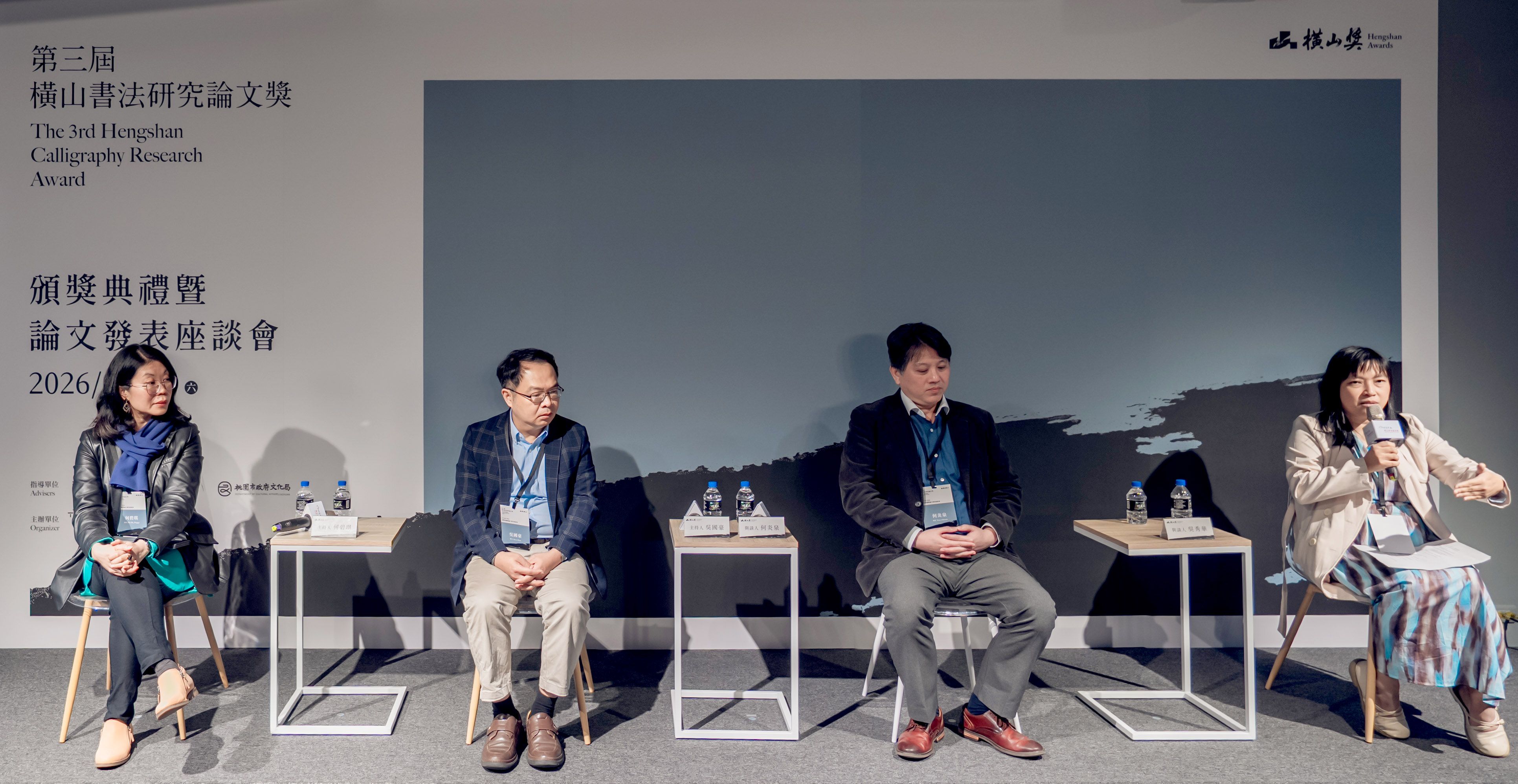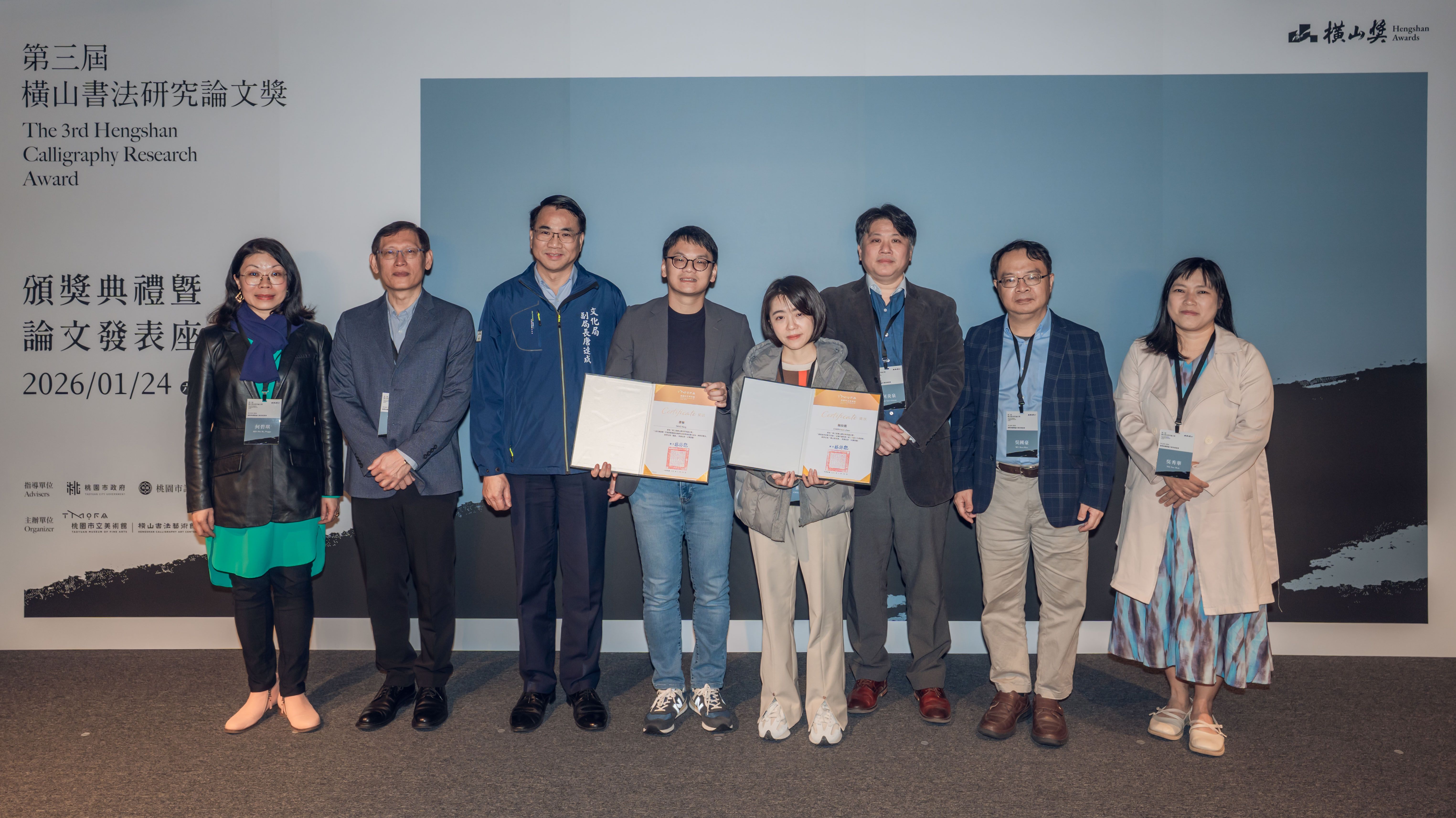 桃園市立美術館(以下簡稱桃美館)為持續培植與發掘書法藝術研究人才,並推動書法研究於在地與國際、傳統與創新、理論與實踐等多重面向的深化發展,由橫山書法藝術館(以下簡稱書藝館)主辦之「第三屆橫山書法研究論文獎」(以下簡稱論文獎),於2026年1月24日隆重舉行頒獎典禮暨獲獎論文發表座談會。本屆頒獎典禮邀請何創時書法藝術基金會董事兼主任研究員吳國豪代表國際評審團致詞,並特別播放中國浙江大學藝術與考古學院教授薛龍春之預錄評審致詞影片,由桃園市政府文化局副局長唐連成及國際評審團共同頒發各獎項,活動同時進行三場次獲獎論文發表座談會,邀集評審、提名人與獲獎者進行深入討論與交流,促進國際書法研究經驗與學術觀點之對話。