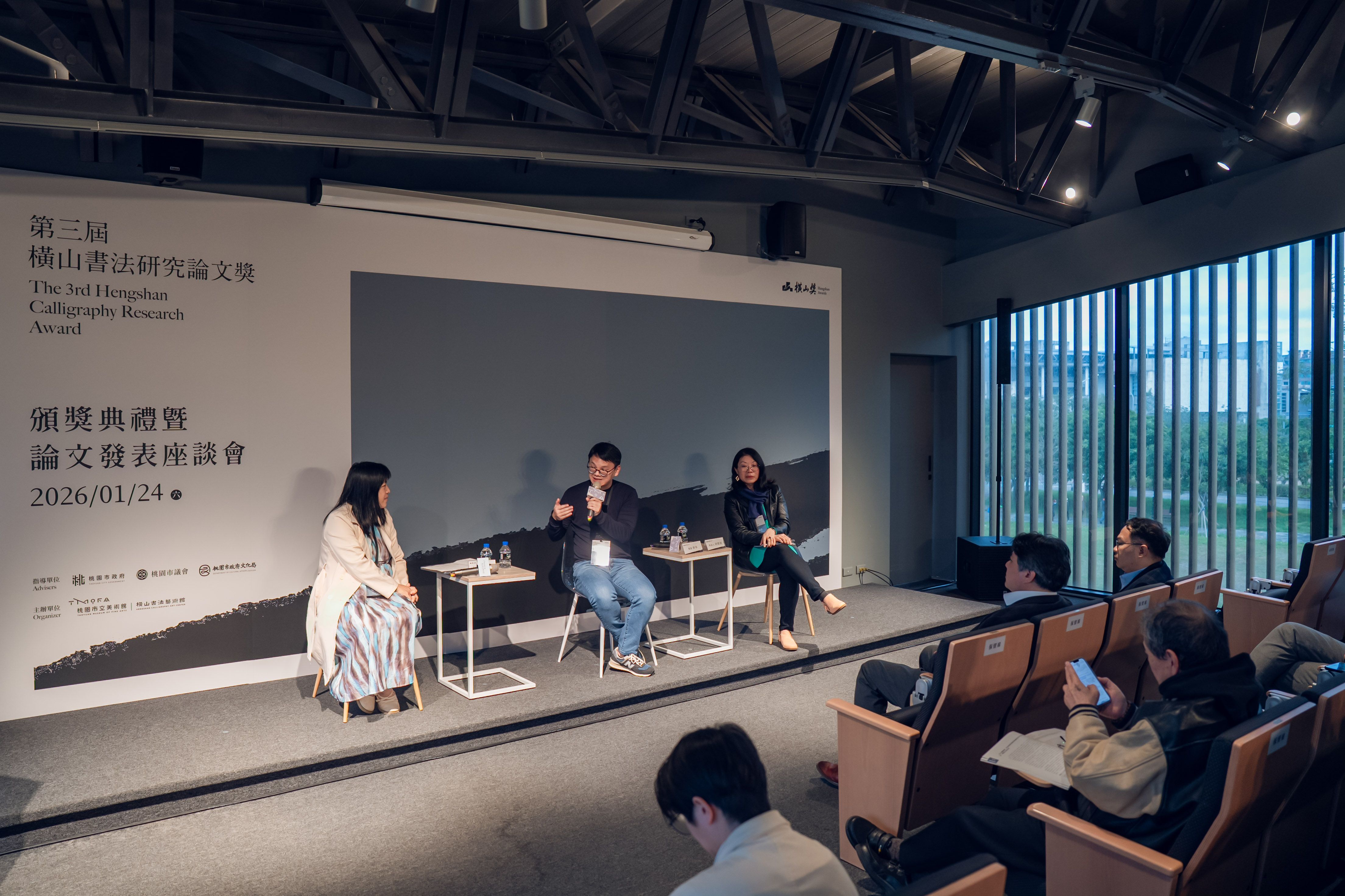 桃園市立美術館(以下簡稱桃美館)為持續培植與發掘書法藝術研究人才,並推動書法研究於在地與國際、傳統與創新、理論與實踐等多重面向的深化發展,由橫山書法藝術館(以下簡稱書藝館)主辦之「第三屆橫山書法研究論文獎」(以下簡稱論文獎),於2026年1月24日隆重舉行頒獎典禮暨獲獎論文發表座談會。本屆頒獎典禮邀請何創時書法藝術基金會董事兼主任研究員吳國豪代表國際評審團致詞,並特別播放中國浙江大學藝術與考古學院教授薛龍春之預錄評審致詞影片,由桃園市政府文化局副局長唐連成及國際評審團共同頒發各獎項,活動同時進行三場次獲獎論文發表座談會,邀集評審、提名人與獲獎者進行深入討論與交流,促進國際書法研究經驗與學術觀點之對話。